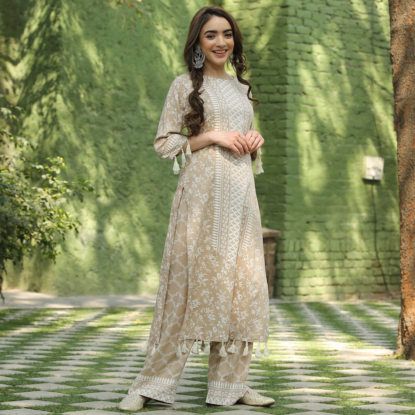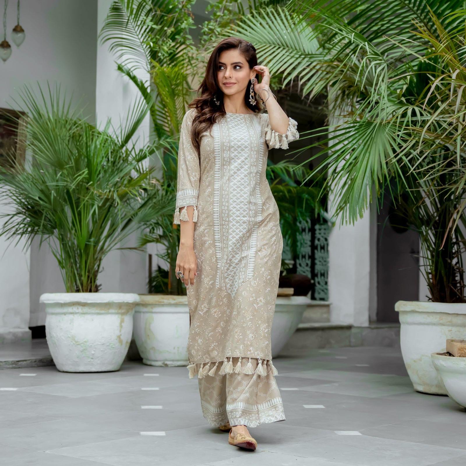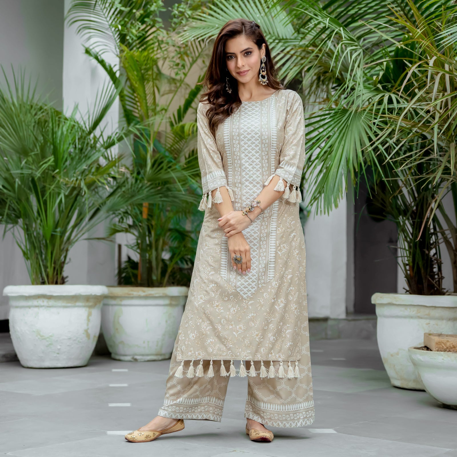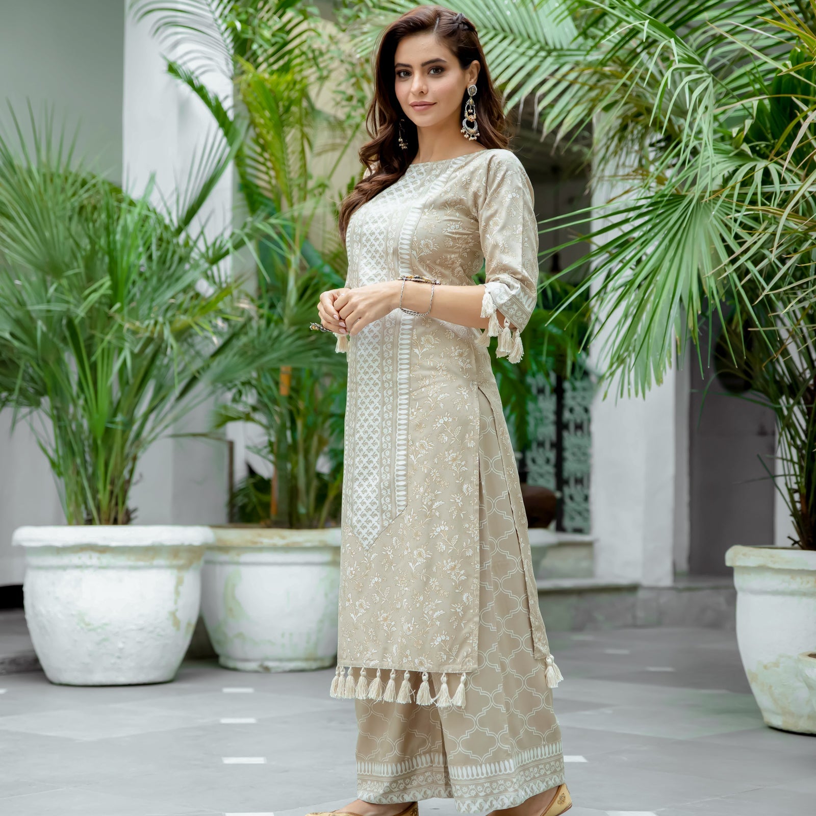 Beige Kurta Palazzo Co-ord Set with Tassel Details
