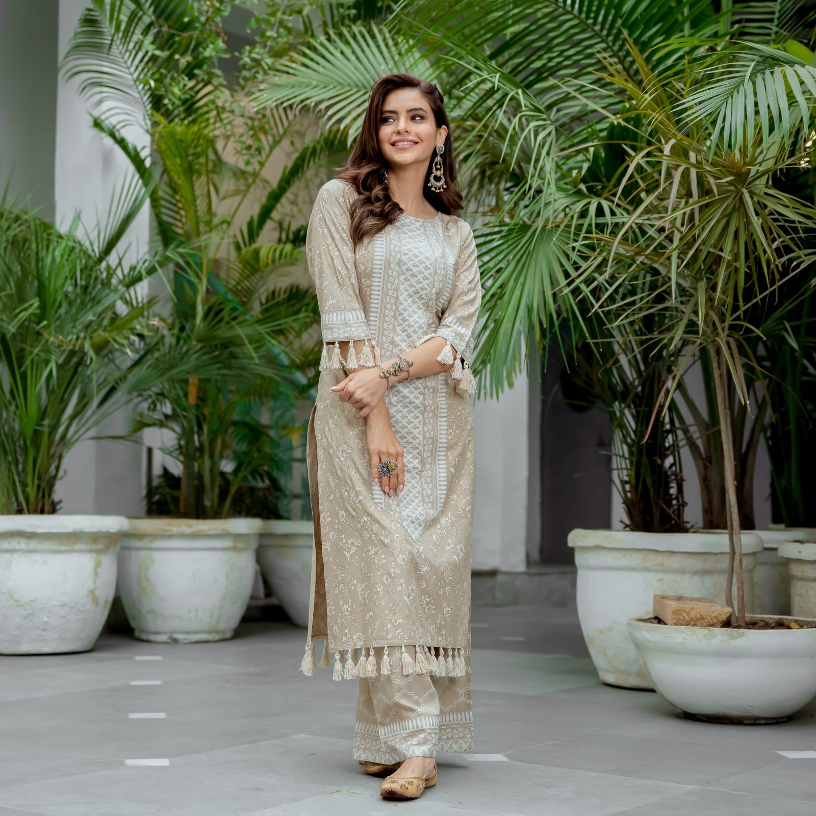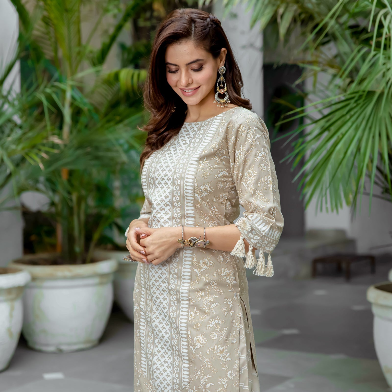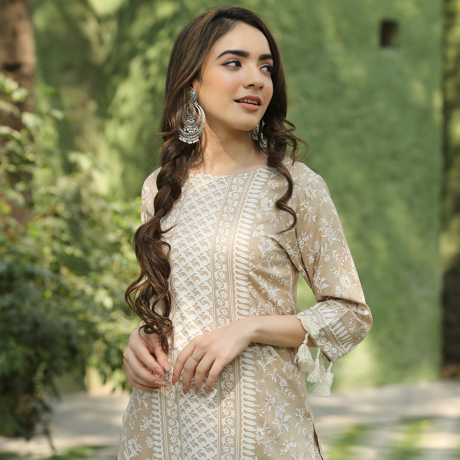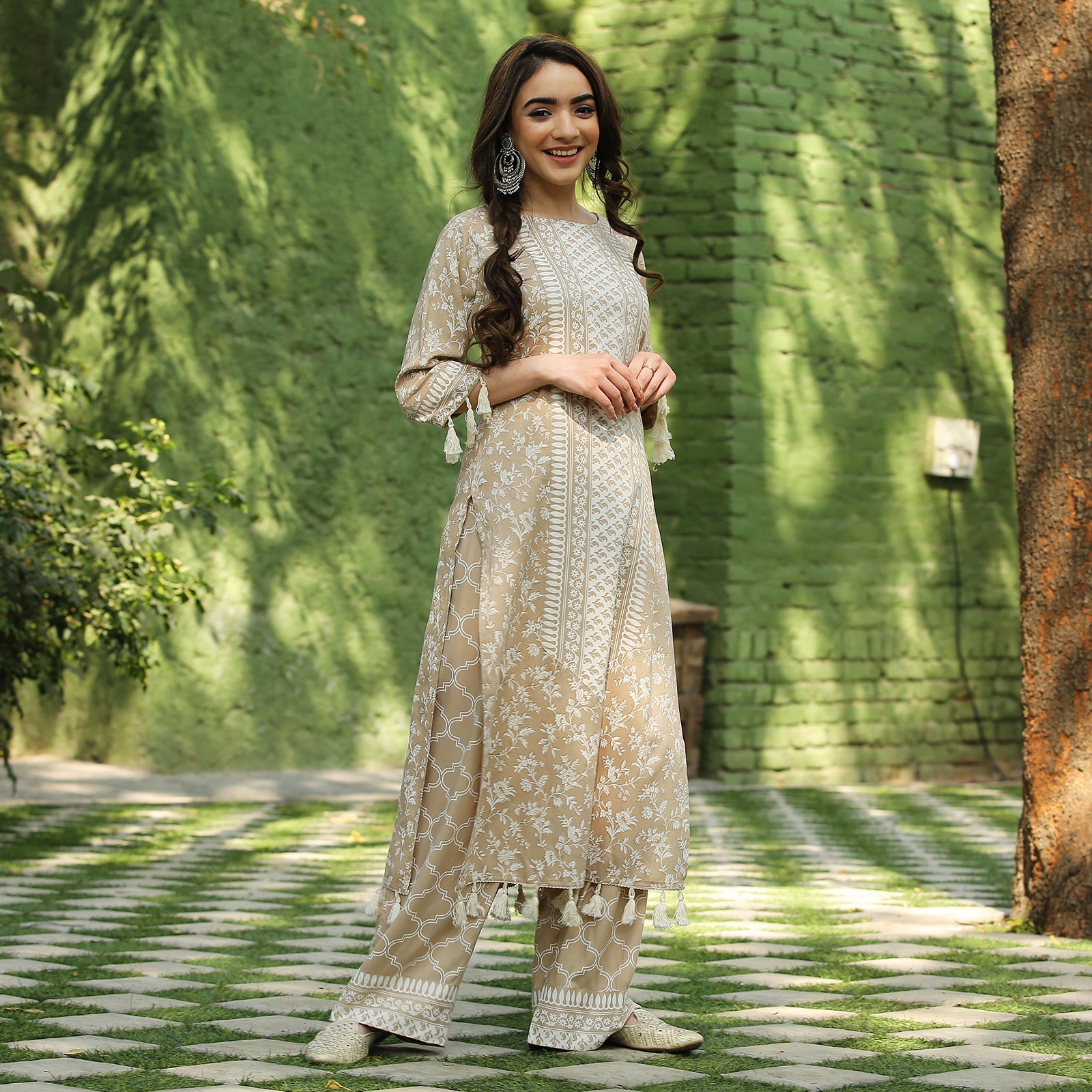Beige Kurta Palazzo Co-ord Set with Tassel Details