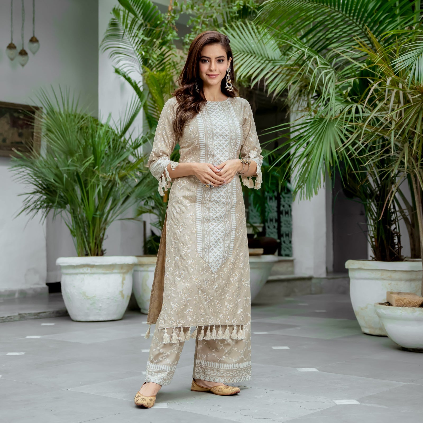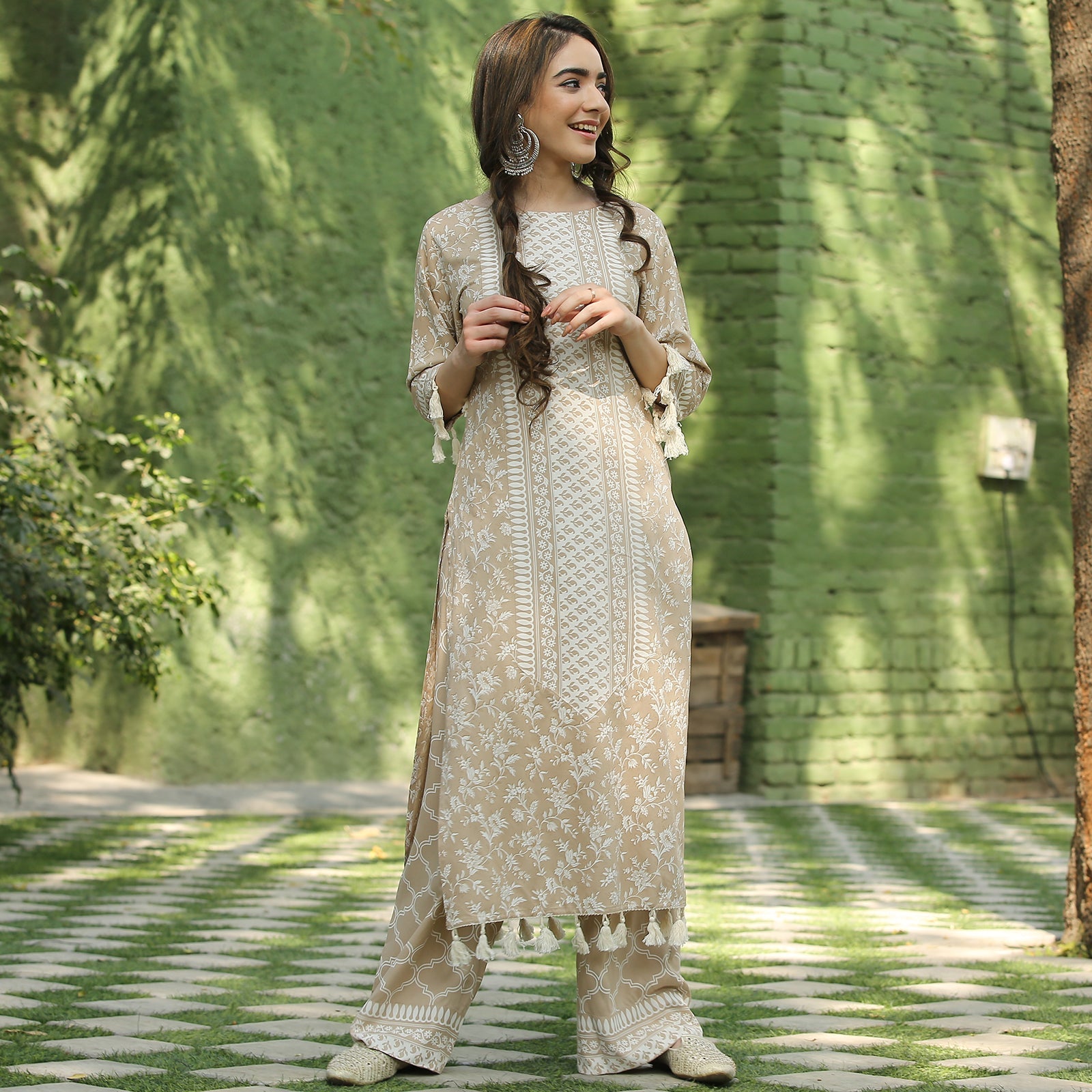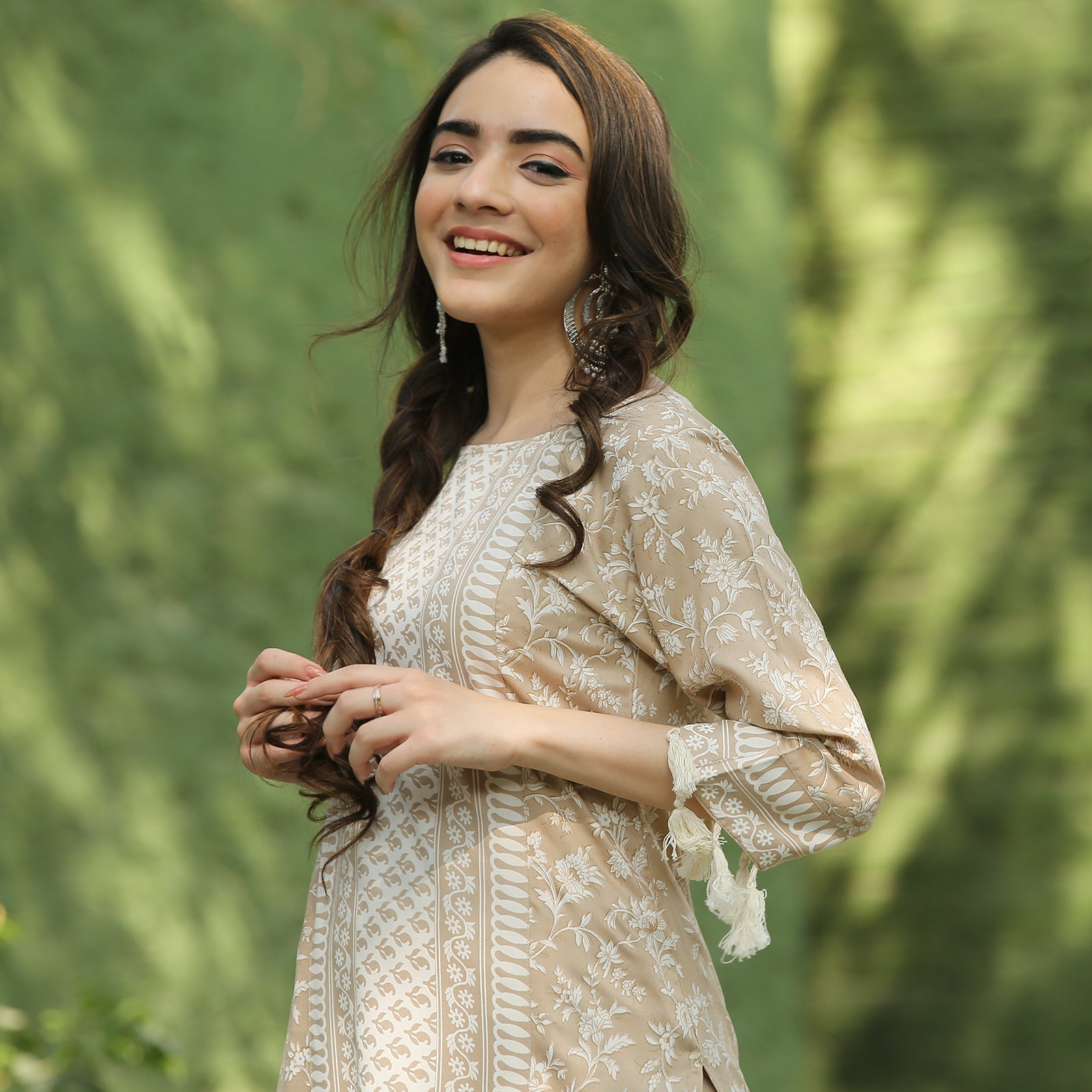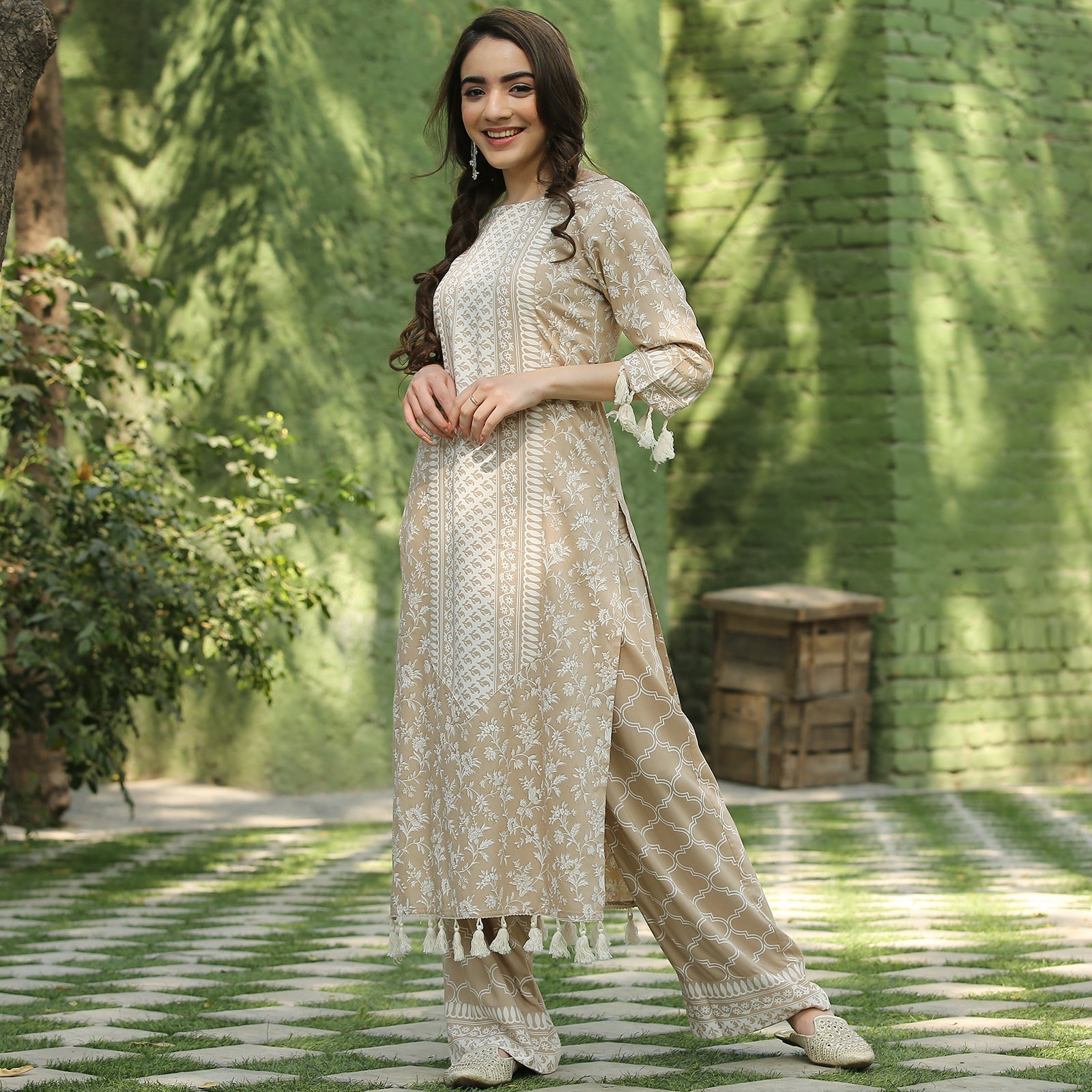 Beige Kurta Palazzo Co-ord Set with Tassel Details