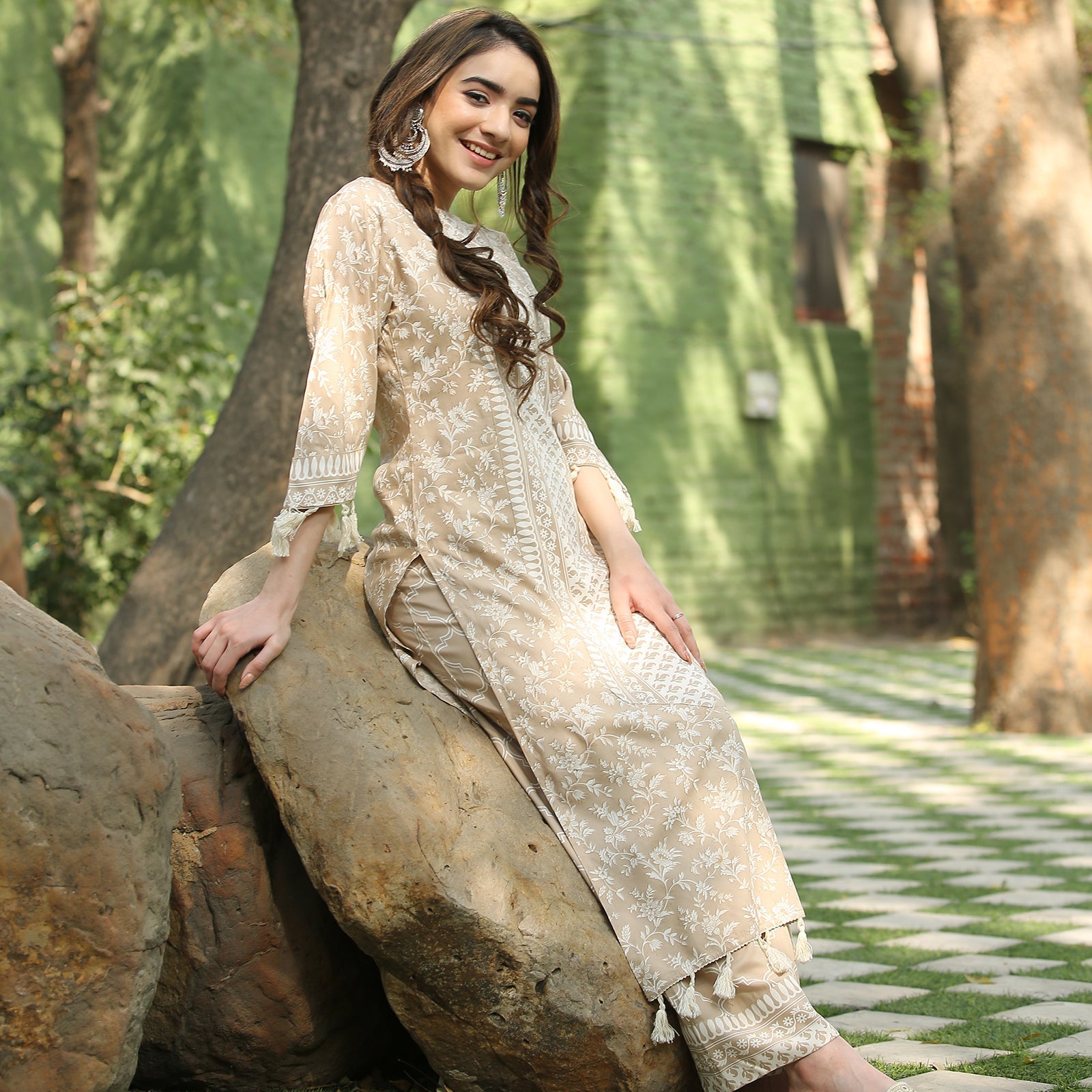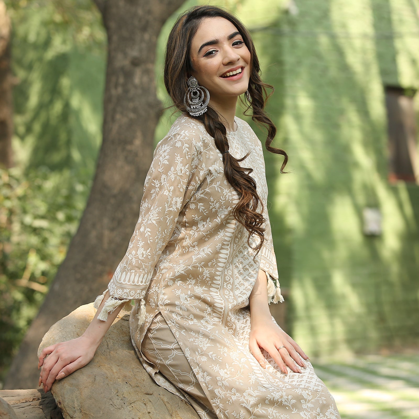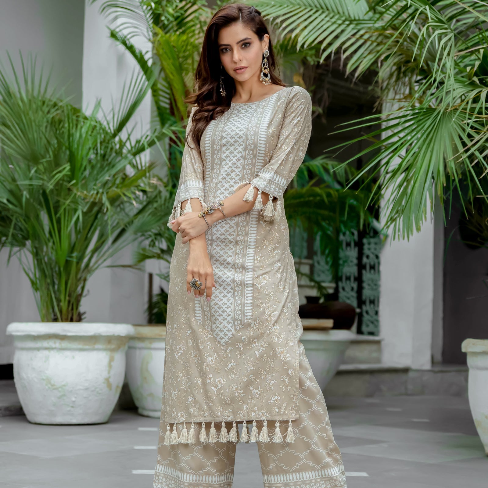 This beige kurta palazzo co-ord set is crafted with the best LIVA fabrics to give you a smart look. Be it an office party or any small get together, you can always style this set with your favorite pair of jewelry.