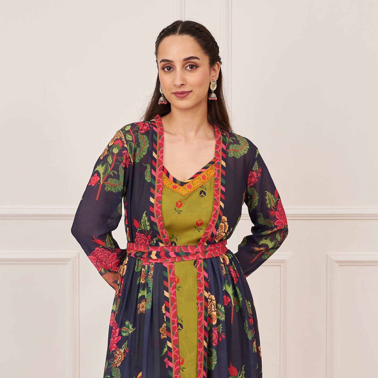 Olive Printed Tunic and Pant Set with Navy Tiered Long Shrug and Belt
